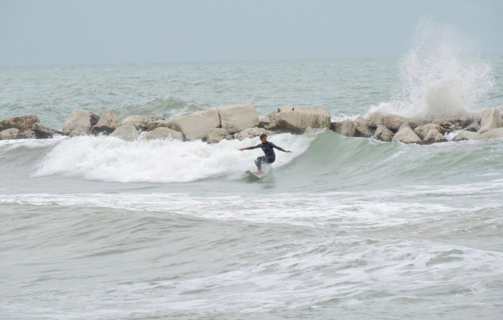 Raggiungete il lato nord della foce del fiume Marecchia, circa 1 km a nord del porto di Rimini. Nella baietta a sinistra del molo rompono divertenti sinistre con mareggiate da N, N/E ed E anche con vento attivo; mentre in condizioni di mare grosso da E o enorme da S/E la secca davanti al fiume genera lente ma lunghissime onde riparatissime dal vento di Scirocco.